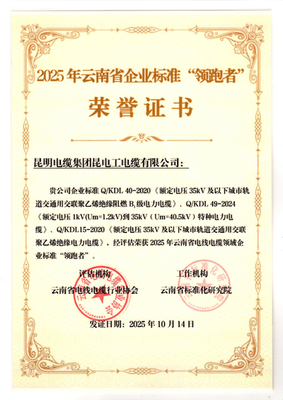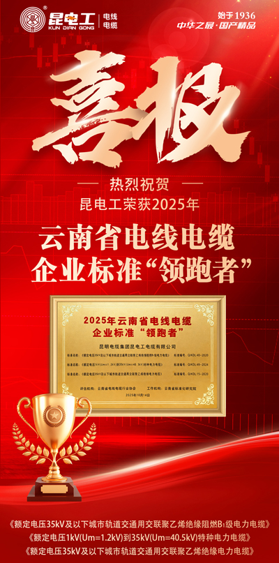 此次獲評標志著昆電工電纜在技術研發、產品創新、質量管控等領域達到云南省行業標桿水平。昆電工始終秉持“做線纜行業高質量發展引領者”的企業愿景,持續推動電線電纜行業標準化建設,為云南省制造業高質量發展注入強勁動能!
