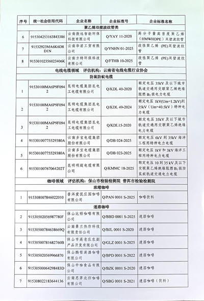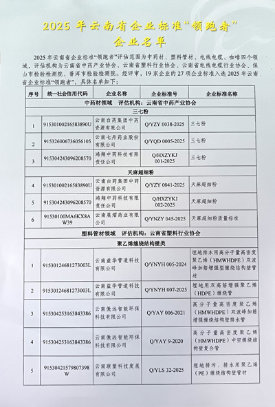 經評審,中藥材領域的云南白藥集團、云南七丹藥業、鴻翔中藥公司、云南展熠藥業4家企業的6項企業標準入選;塑料管材領域的云南益華管道、云南傲遠公司、云南聯塑公司、云南華諾公司、云南方特公司5家企業的8項企業標準入選;電線電纜領域的昆明電纜集團昆電工公司、云南多寶電纜集團、昆明明超公司3家企業的6項企業標準入選;咖啡領域的普洱愛伲莊園、保山比頓咖啡、云南景蘭公司、保山市高老莊公司、保山鵬程滇潞咖啡、保山中咖食品公司、云南思茅北歸咖啡7家企業的7項企業標準入選。最終,共19家企業的27項企業標準入選2025年云南省企業標準“領跑者”。