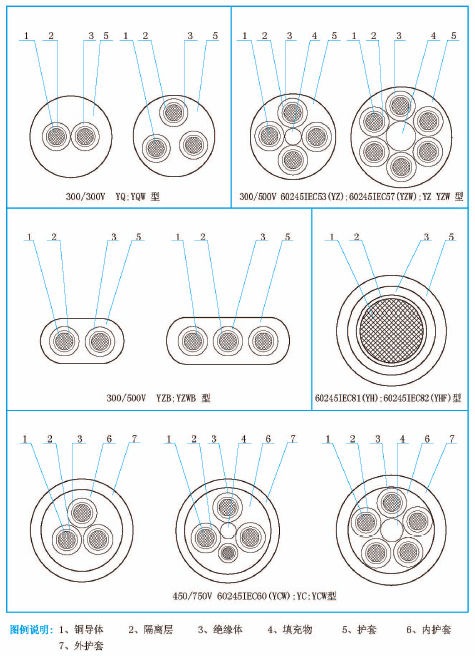 我廠生產(chǎn)的額定電壓450/750V及以下橡皮絕緣軟電纜、300/500V及以下橡皮絕緣電線及軟線是按照中華人民共和國國家標準GB5013.1~5013.7—2008和機械行業(yè)標準JB8435.1~8735.3—2011以及JB1601-93設(shè)計制造的。